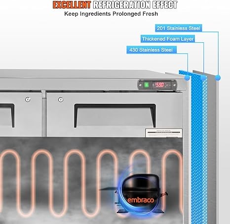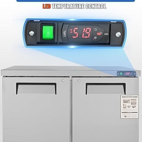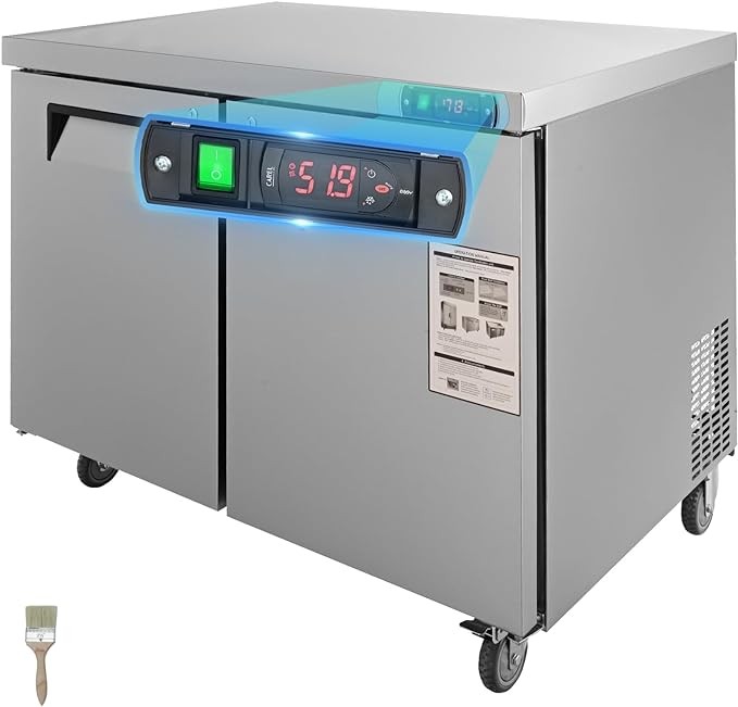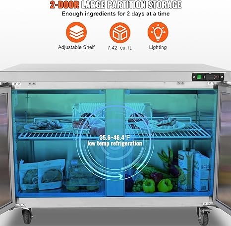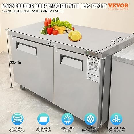 VEVOR Commercial Refrigerator, 48 Worktop Undercounter Refrigerator, 12.85 Cu. Ft Thick Stainless Steel Refrigerated Food Prep Station, 2 Door Worktop Fridge with lock for Restaurant, Bar, Diner