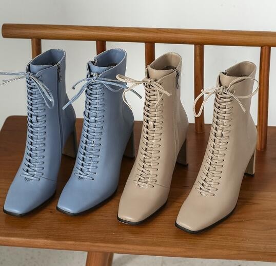Womens Square Toe Lace Up High Heel Ankle Boots Formal Ol Leisure Boots Shoes